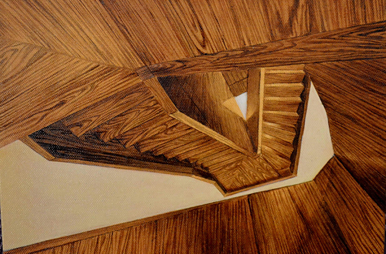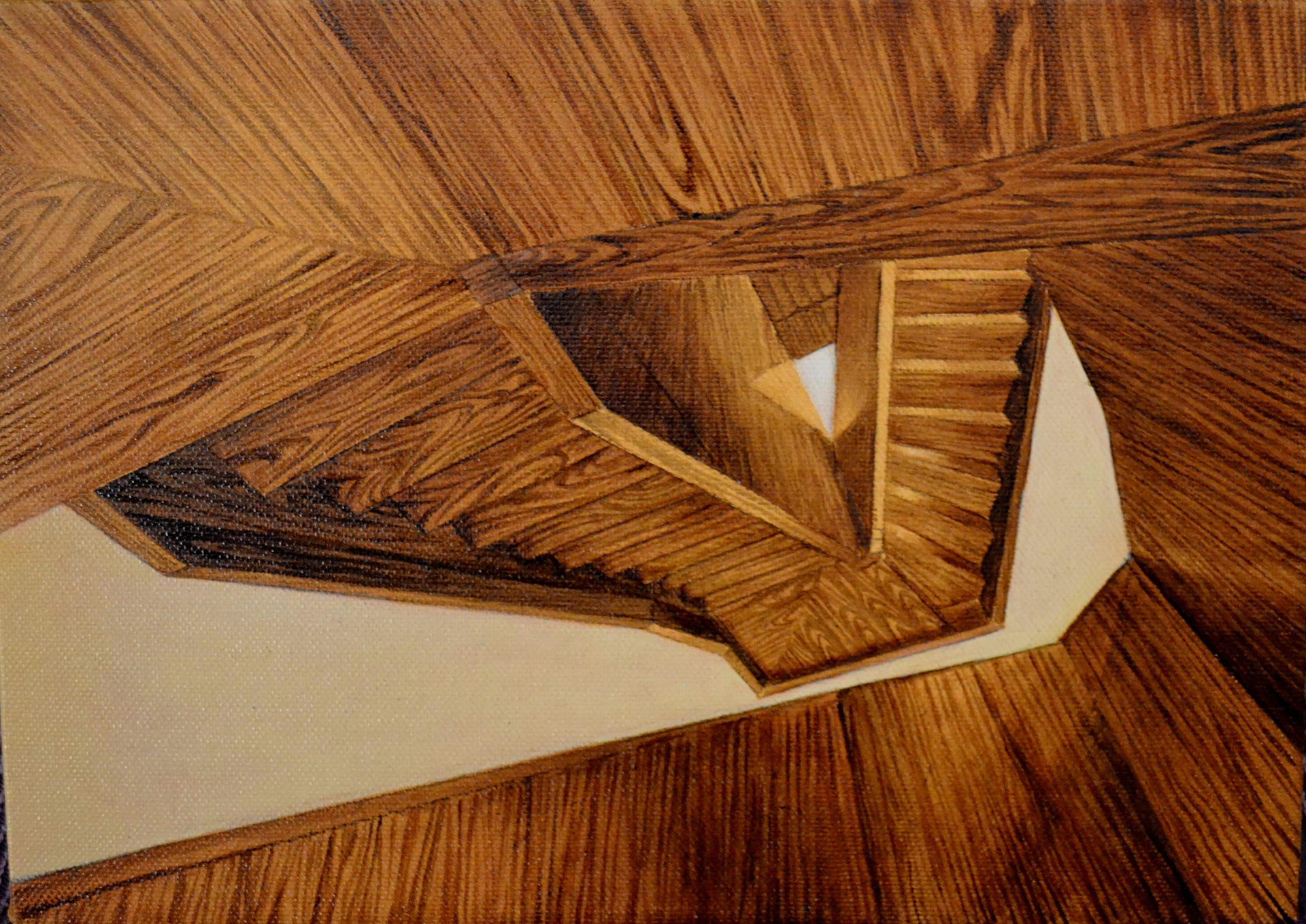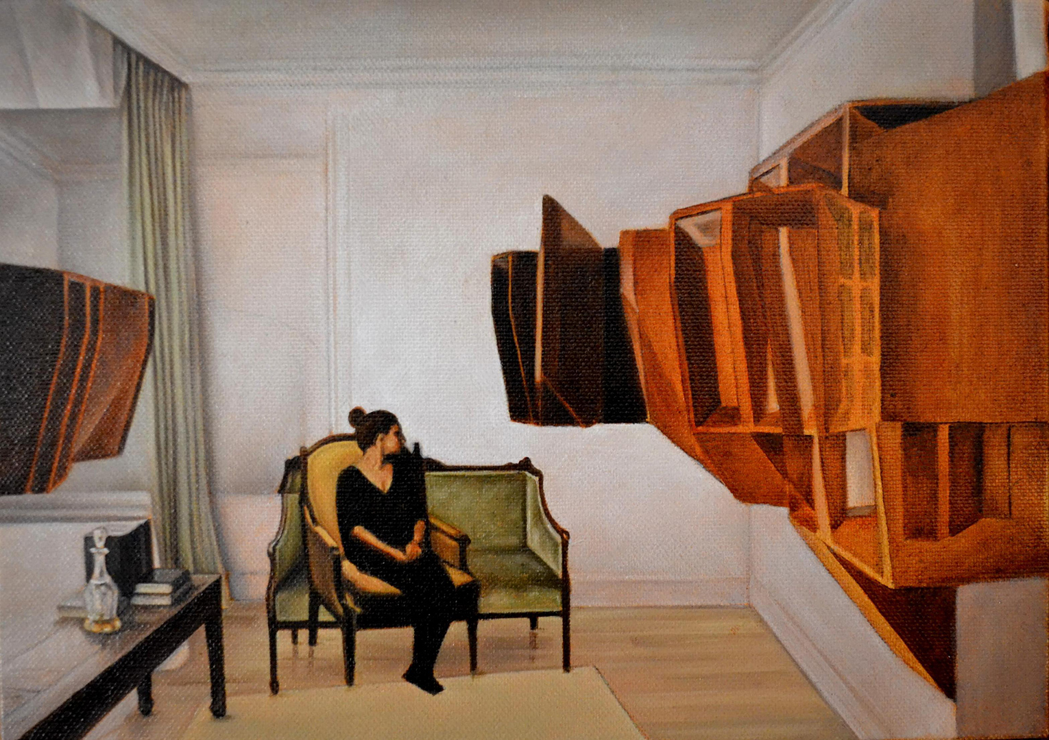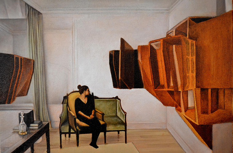 In contrast, the small oil paintings act as tangible extensions of these spaces, transforming into domestic artifacts and vessels of memory, objects that preserve and continue the life of the architecture they portray.