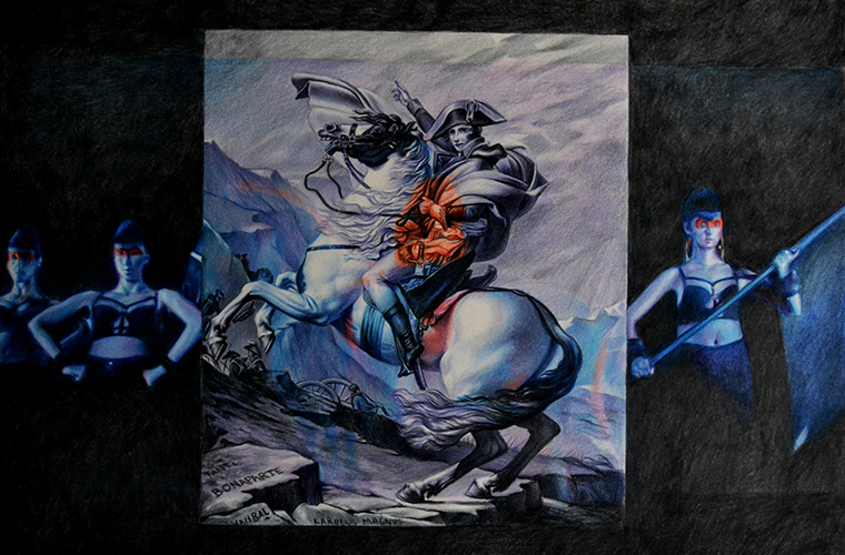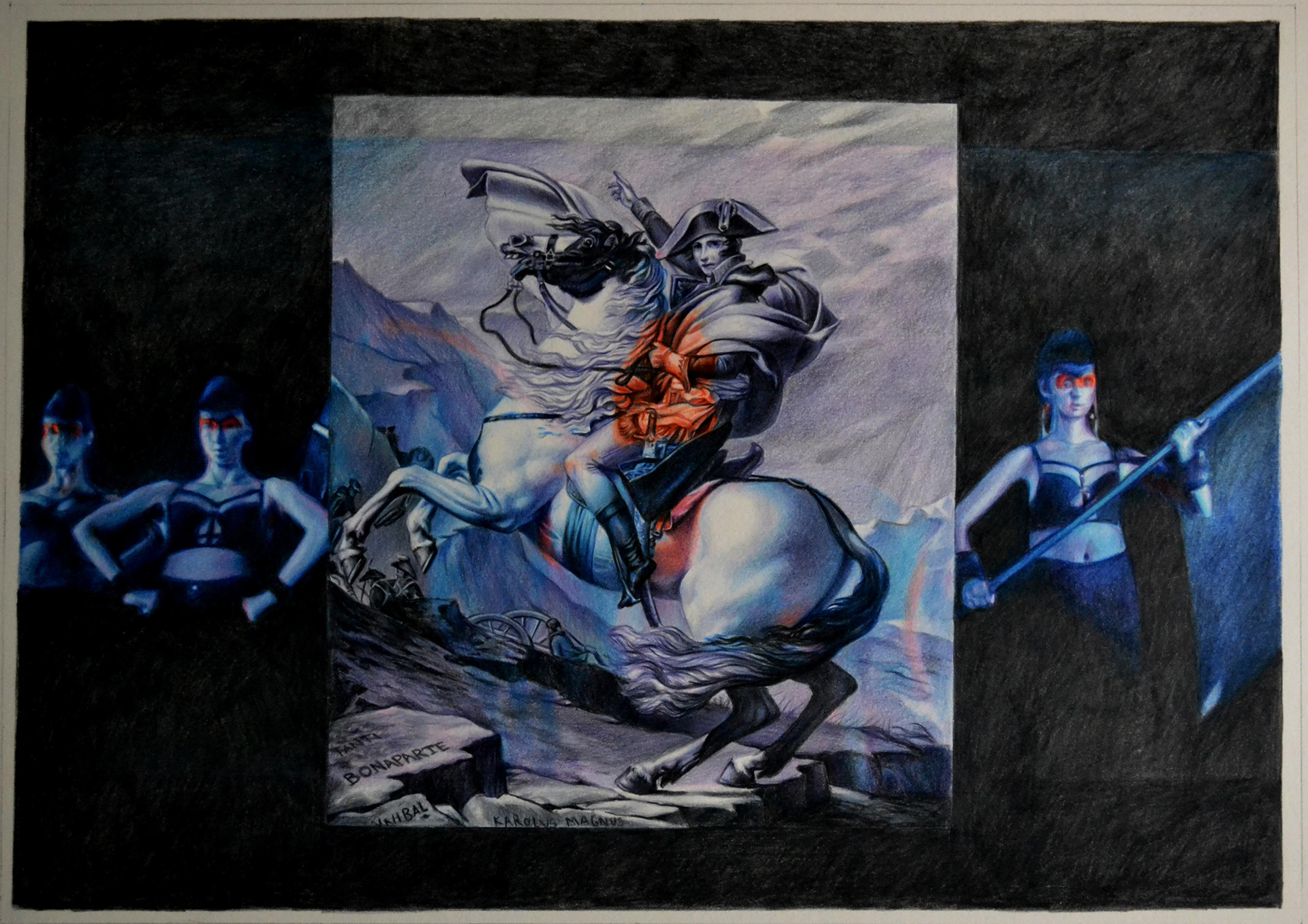 This artwork is fairly straightforward: it is the result of the superimposition of two images—a historical painting and a still from a contemporary music video. It serves as a study of how historical imagery becomes intertwined, perhaps unconsciously, in the production of contemporary representations. In this particular case, the famous Neoclassical propaganda painting by Jacques-Louis David, Napoleon Crossing the Alps, is intermeshed with a still from the music video Trampoline by Tinie Tempah.