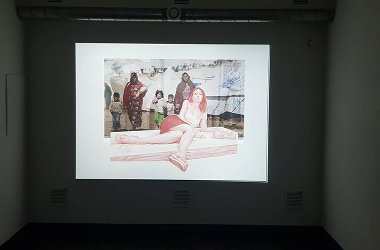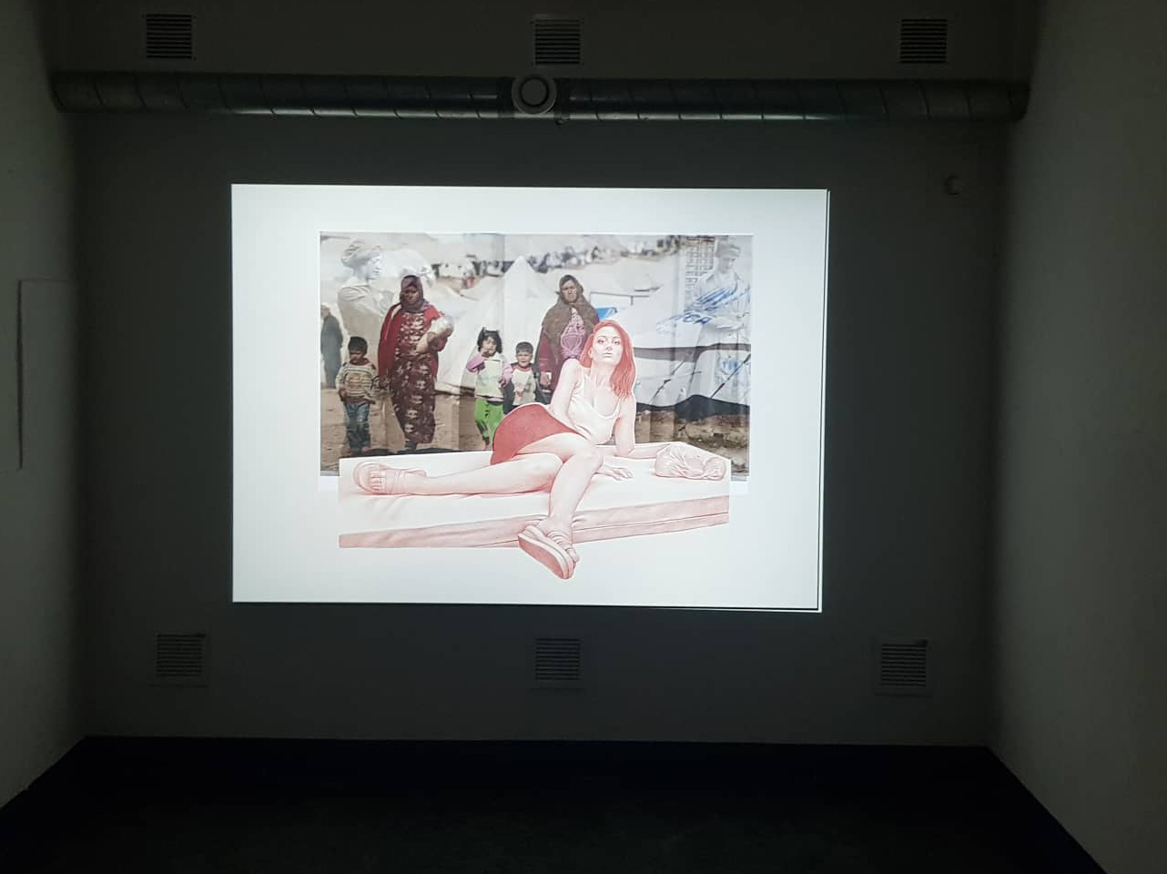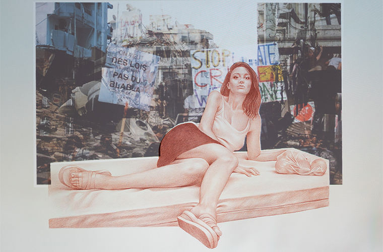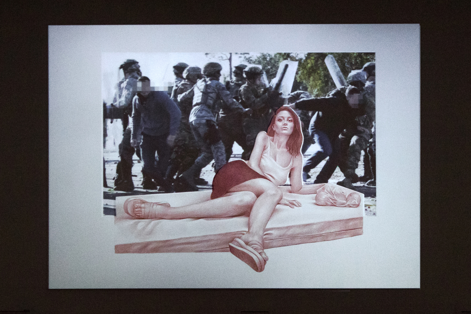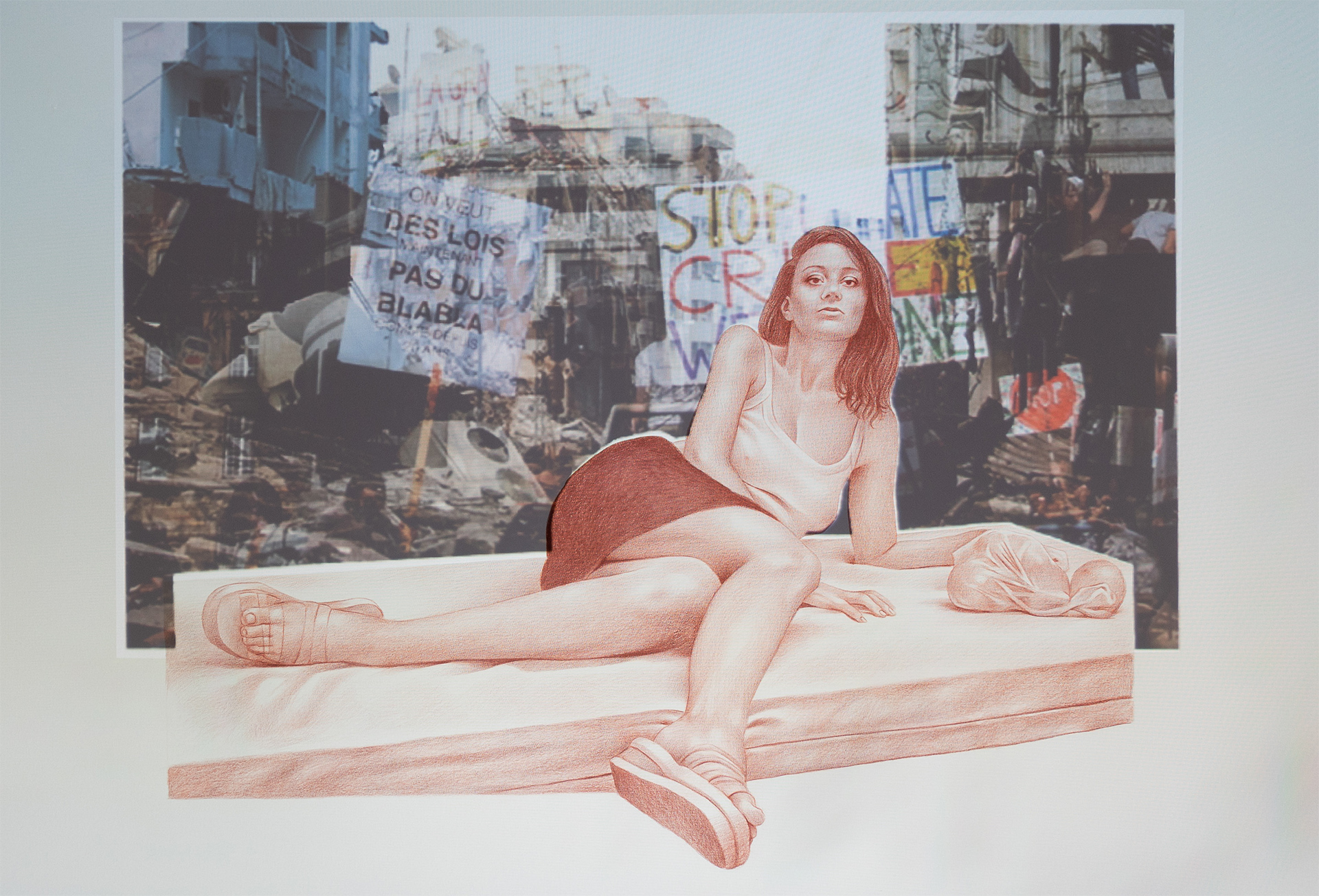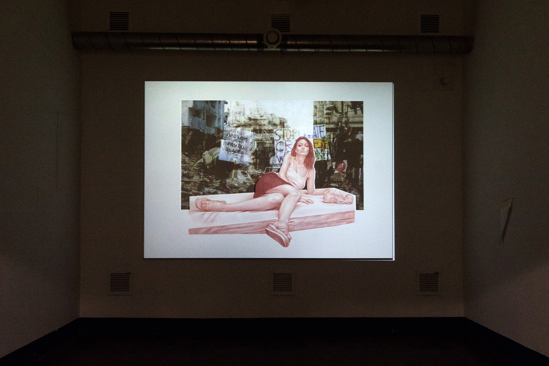 In-Between is a hybrid artwork that merges drawing, printing, and interactive projection. The piece invites the audience to alter the background—and thus the context—within which a reclining female figure is presented. This interaction is made possible through an onsite laptop equipped with custom software developed by Justin Azzopardi (Distoreality.com), allowing viewers to manipulate and edit the projected visuals in real time.
