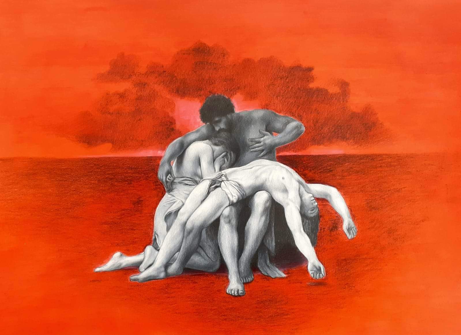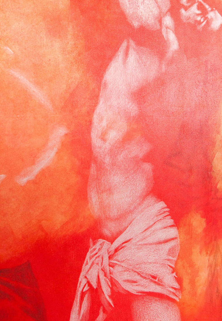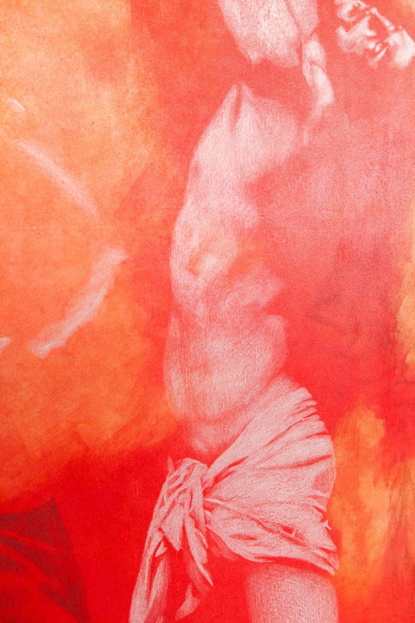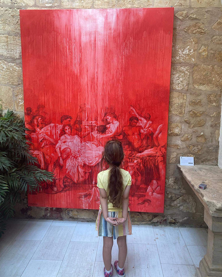 The artworks, executed in mixed media on canvas, combine black pencil, white chalk, and oil paint, inspired by hand-coloured vintage photographs. Their grainy surfaces evoke nostalgia, while subtle distortions bridge past and present. The large-scale paintings fill Il-Kamra ta’ Fuq, immersing viewers in a glowing red atmosphere meant to mirror the artist’s inner world. This project, deeply personal yet universally resonant, meditates on memory, mortality, and the timeless continuity of human experience.